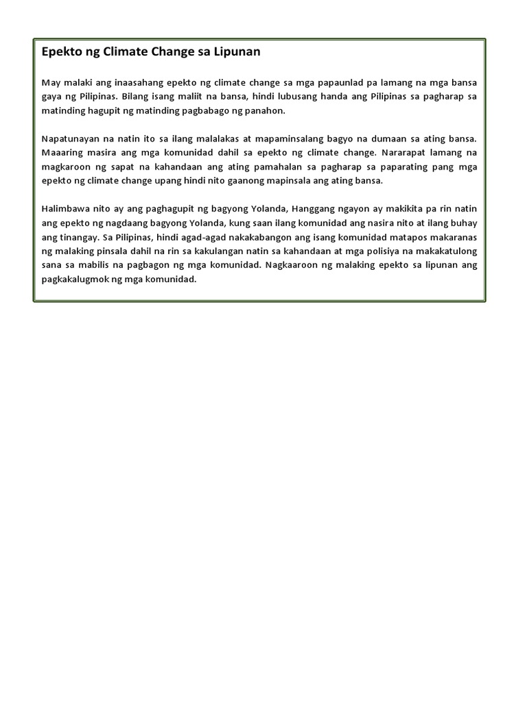 Parang sa isang iglap lang nawala ng lahat ultimo pinaghirapan ng mga taong nakatira dito. Bago ang bagyong Yolanda. Una na dito ang pag-init ng sobra ng klima o mas kilala sa tawag na global warming brainlyphquestion2407609.