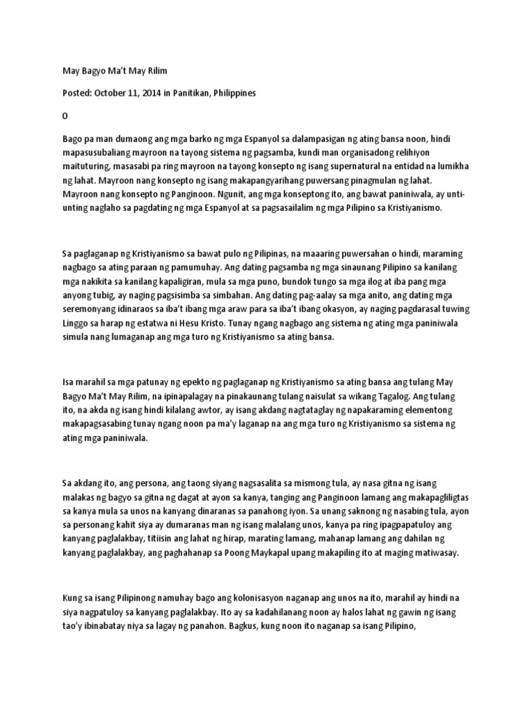 Binubuo ang tula ng limang saknong at bawat saknong ay may anim na taludtod na may sukat na pipituhin at tugmang isahan. MAY BAGYO MAT RILIM The story of May Bagyo Mat Rilim is about the struggles and problem in life. 451-452 ng edisyong 1935 na sinulat diumano ng isang di-kilalang Tagalog una persona tagala.